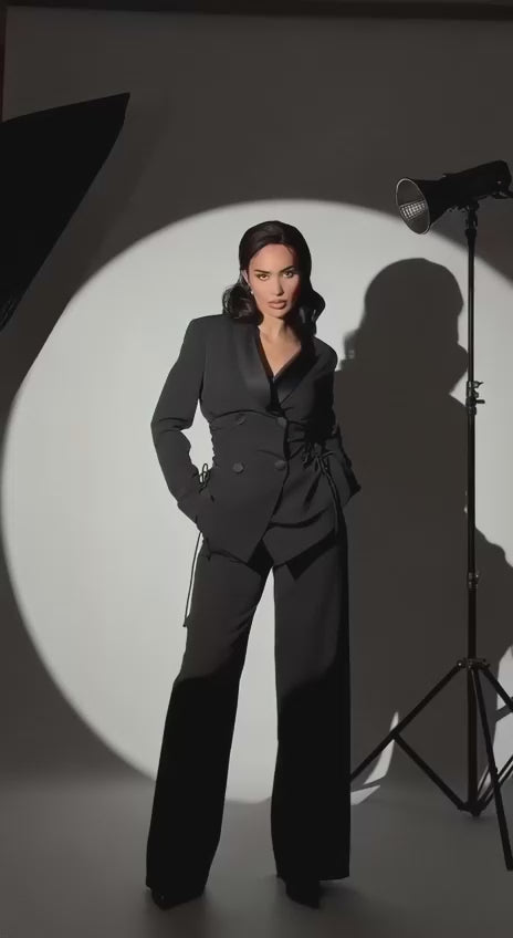 Lace-Up Black tailored wrap suit with wide-leg trousers for a bold, elegant, and confident look.